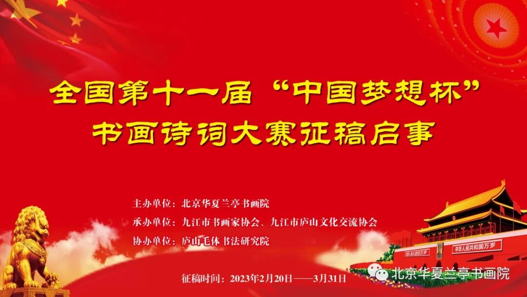 2023年是习近平总书记提出实现中华民族伟大复兴中国梦奋斗目标的十一周年。十一年来,“中国梦”已经成为凝聚党心民心,激励中华儿女为实现这一目标而奋斗的精神力量。癸卯兔年,序幕初开,春风十里,我们踏梦前行,继续用书画艺术追逐中国梦,让中国梦在新时代的道路上继续飞翔。为此,继续举办全国第十一届“中国梦想杯”书画诗词大赛,着力保持向上向善向好的浓厚艺术氛围。主办单位:北京华夏兰亭书画院 承办单位:九江市书画家协会、九江市庐山文化交流协会