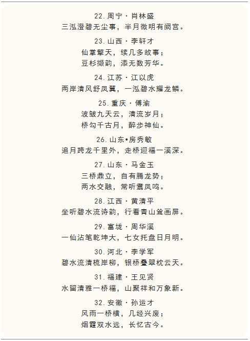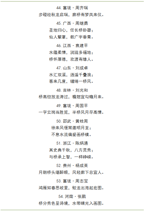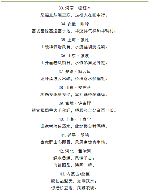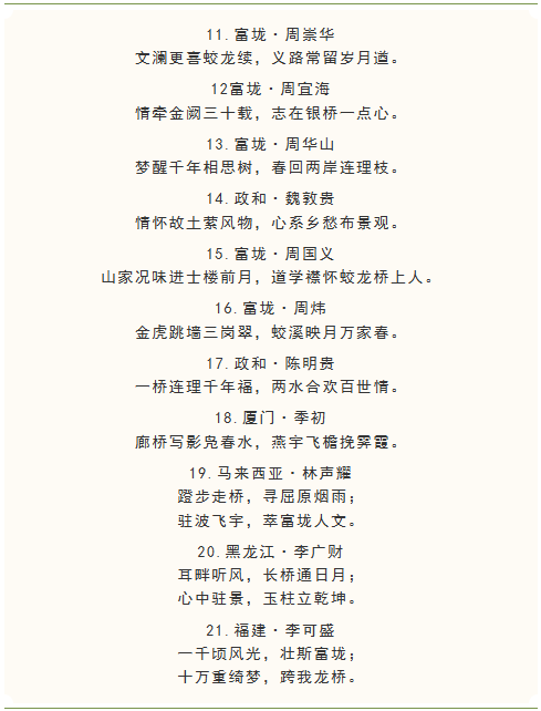 福建省政和县澄源乡富垅村“蛟龙桥”立柱楹联征集从2月7日开始,至3月16日截稿。一个多月来,收到全国各地(含港澳台地区)及马来西亚、泰国、新加坡等海外华人华侨2600多副优秀楹联作品,这些作品有的意境高远内涵深邃,有的诗意盎然构思精巧,有的立意鲜明蕴含哲理......但由于廊桥立柱有限,我们只能从这些优秀作品中精挑细选出扣紧富垅村历史、人文、地理、民俗的其中56副采用,其余优秀作品,我们只能忍痛割爱。感谢全国各地爱心人士的真情奉献,感恩各位创作者的辛勤付出!现将拟采用楹联作品公布如下,政和县外入选作者我们将尽快与您取得联系。在此,一并感谢中华诗词学会、中国楹联协会会员、山东潍坊程宜文先生,中国楹联中诗社社员、福建省诗词学会会员、政和县作家协会副主席张大泽先生倾情助力、品评雅鉴!
