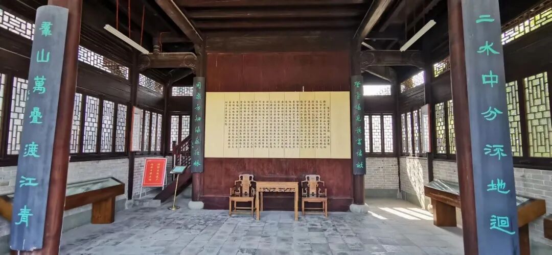 钟灵台内。对联:二水中分深地迥,群山万叠渡江青