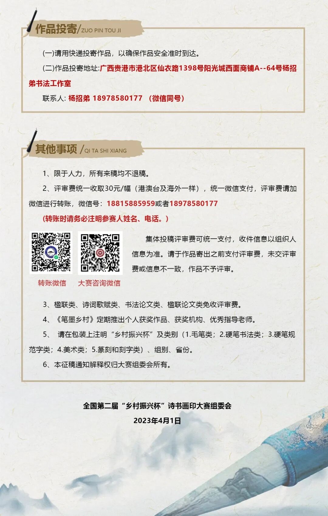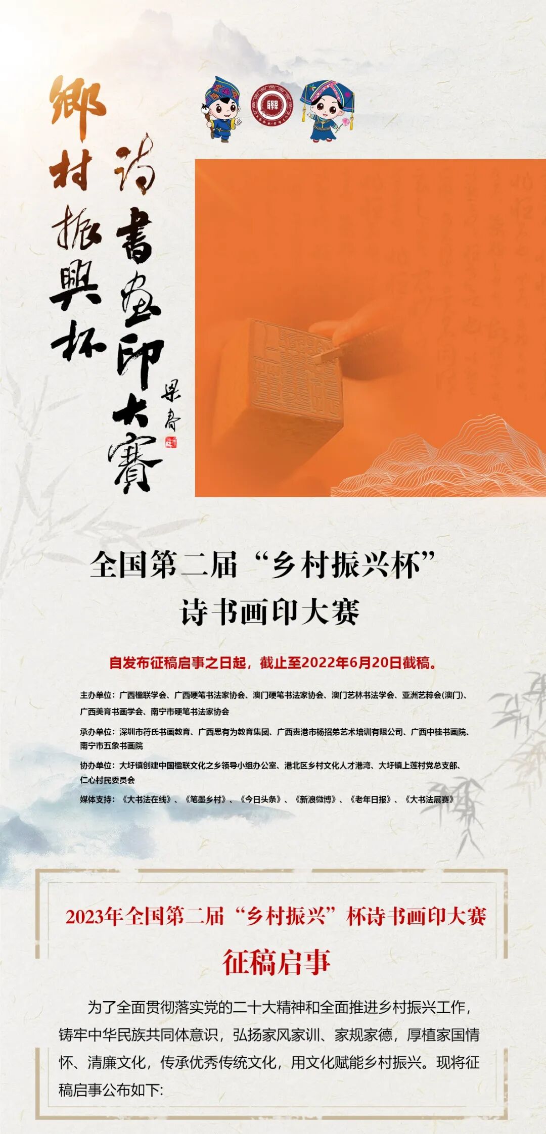 2023年全国第二届“乡村振兴杯”诗书画印大赛征稿启事[color=var(--weui-FG-2)]诗书画院 [color=var(--weui-LINK)][url=]征文天下[/url] [color=var(--weui-FG-2)]2023-04-05 19:14 [color=var(--weui-FG-2)]发表于吉林