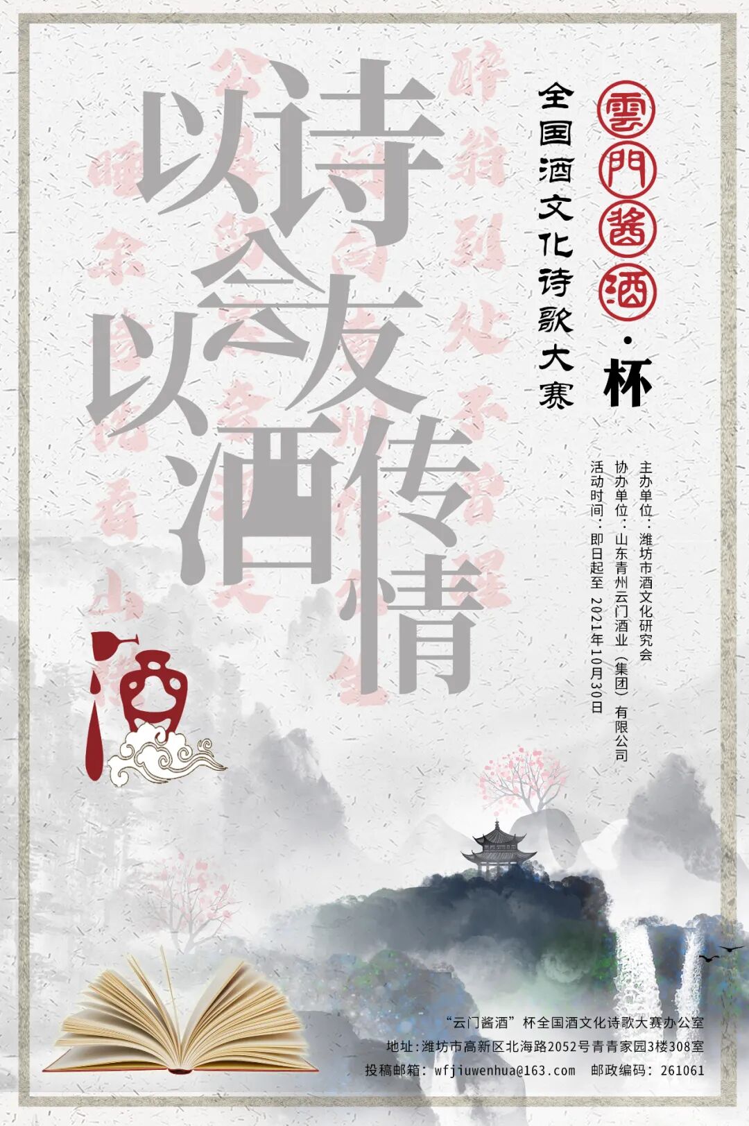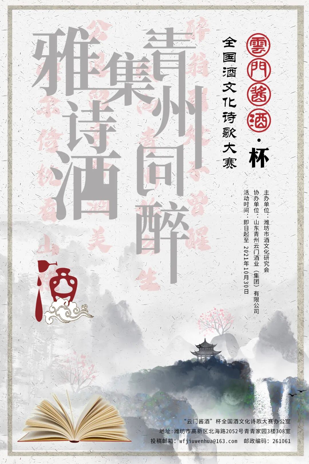 261061 潍坊市高新区北海路2052号青青家园3楼308室 “云门酱酒”杯全国酒文化诗歌大赛 办公室收。