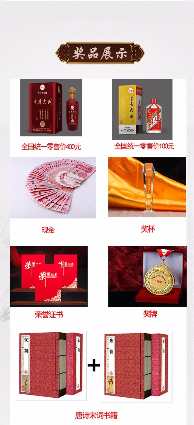 一等奖2名(人气排名前三) 1、价值3000元奖品(酒)或现金 2、价值300元诗文书籍一套 3、大赛获奖奖牌一枚 4、大赛获奖奖杯 5、大赛获奖证书