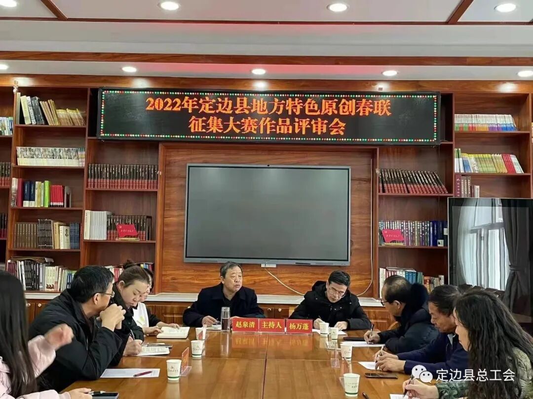 定边县总工会举办2022年定边县地方特色原创春联征集大赛活动定边县总工会 2022-01-29 11:49 为了践行县委“12365”发展思路,传承中华春联文化,为全县职工群众提供春联文化产品服务,营造浓郁的过年氛围,在2022年春节到来之际,定边县总工会、县图书馆联合举办了“2022年定边县地方特色原创春联征集大赛”。 此项活动共征集来自全国各地参赛作品1100余副,经楹联专家组评审,共评出一等奖10名、二等奖20名、三等奖30名。以征集春联形式,传承了中华春联文化,反映定边发展变化,为实现“两区一中心”奋斗目标提供文化服务。