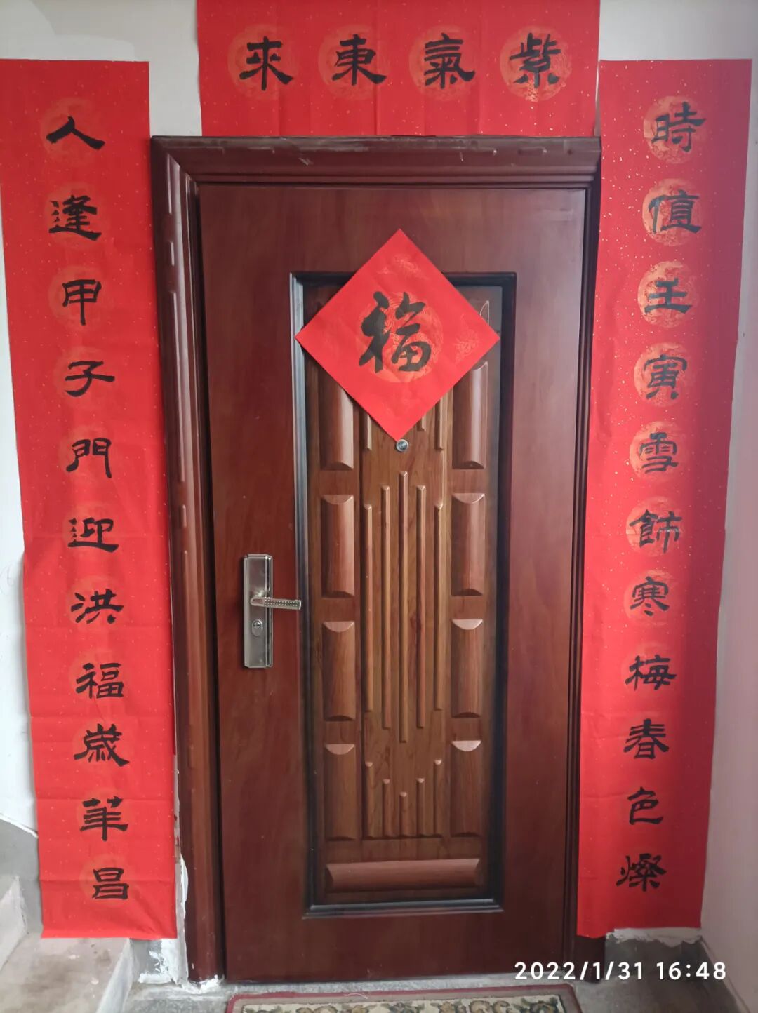 王松坪 时值壬寅,雪饰寒梅春色灿; 人逢甲子,门迎洪福岁华昌。 横批:紫气东来 简评:切合“我为自家写春联”活动的的本意。上联切景。新城区的雪是吝啬的,难得辛丑除夕来了一场意外的棉花雪,给我们以惊喜和快乐。雪后的寒梅,必将绽放得妩媚动人,雪后的春天,必将是一派撩人的风景。下联切人。人逢甲子,面临退休的年龄,对人生犹有期待,老有所养,老有所乐,更欲老有所为,愿您能开启另一段新的美好征程。“壬寅”、“甲子”,干支对,也是此联的一个亮点。