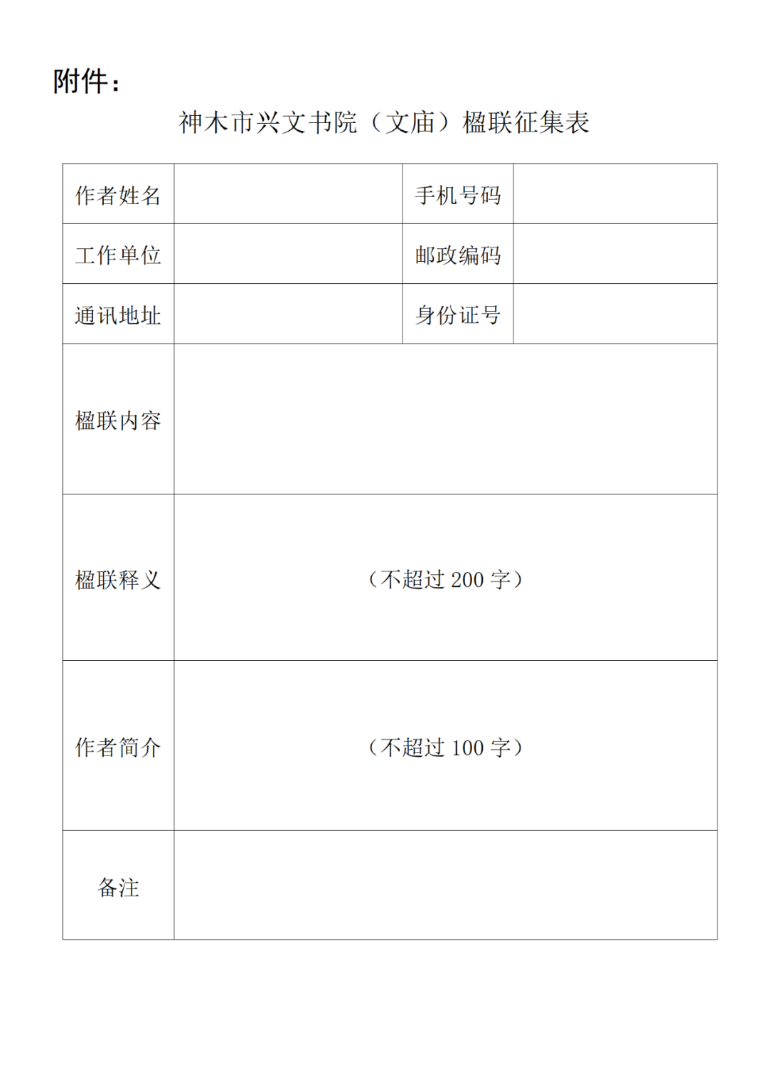 神木市兴文书院(文庙)楹联有奖征集启事 为了丰富兴文书院的文化内涵,促进神木文旅产业高质量发展,现面向全国公开征集相关楹联。 一、征集内容 神木市兴文书院(文庙)正门、棂星门、戟门、大成殿、魁星楼,乡贤、名宦展厅以及东西长廊楹联。 二、征集要求 1.单边联以七至二十言为宜。 2.全联每个字都应注明平仄,并按平水韵调好平仄。 3.若用典,请详注。 4.作品必须是原创且未发表过。 5.所有来稿请注明姓名、单位、通讯地址、身份证号码、联系电话。 三、征集时限 即日起至2022年10月16日止,逾期投稿无效。 四、征集方式 将《神木市兴文书院(文庙)楹联征集表》发送至1042710482@qq.com 五、评选办法 征集方将聘请知名学者、楹联专家对来稿进行评选。 六、奖项设置 特等奖5名,各奖励人民币3000元,并颁发证书;二等奖10名,各奖励人民币2000元;三等奖20名,各奖励人民币1000元;优秀奖30名,各奖励人民币500元,并颁发证书;入围奖35名,颁发证书。 七、其他说明 1.本次活动的征集方不承担作品著作权纠纷引发的任何法律责任。 2.来稿作品一经获奖或入围,其专有修改权、出版权和信息网络传播权即属于征集方,征集方不再向作者另付报酬。凡来稿者,即视为同意本著作权声明。 3.本次活动的最终解释权归征集方所有。 附件:神木市兴文书院(文庙)楹联征集表.doc 联系人:任华 联系电话:13484448201 神木市古城保护建设工作领导小组指挥部办公室 2022年9月16日扫码即可下载征集表